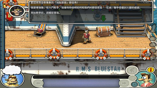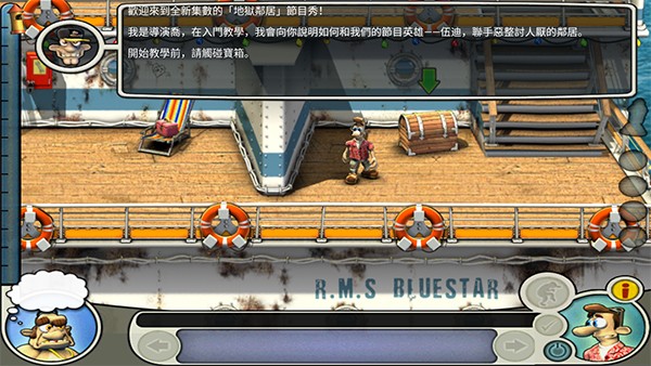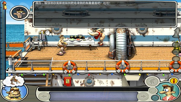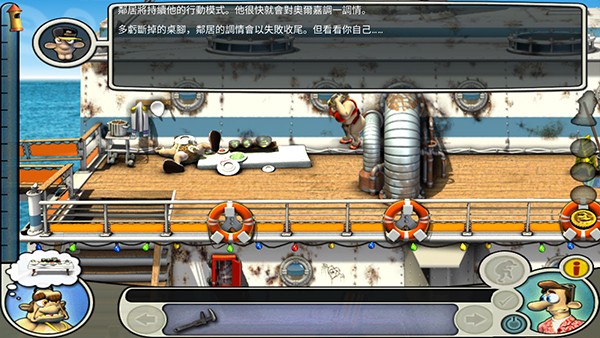 首先等老头离开左下,到左下,拿毯子,直接到右下把毯子铺在舱口上,回左下,还有信号弹要捡;然后等老头离开左上,到左上,等老头离开右中,到右中,捡玻璃碎片,地毯下有密码纸,包里有安眠药,等老头离开右下;到右下,用玻璃碎片把货物架的掉绳割开;到左上等待,等老头离开右中,马上走到右中的楼梯口等待,把握时机,等老头快要中圈套时向下走,走到时老头应该已经离开右下,立即捡起鱼往右上跑;然后上楼梯的时候就选中鱼,然后对左上的花盆使用,使用完后马上往回走,选中右的椅子躲藏(这个一定要快,否则会被老头他妈打);等老头离开右中,老母睡着,马上冲到左下,在水桶上放鱼,拿毛巾,迅速返回右中,再到左上,对脏的玻璃墙用毛巾,然后捡鹦鹉身上的钥匙;回右中,把信号弹装上,到躺椅躲藏;老头被整离开右中,在船长室使用安眠药和密码纸,回到躺椅,恭喜,你通关了。
