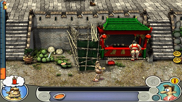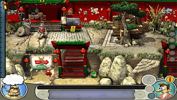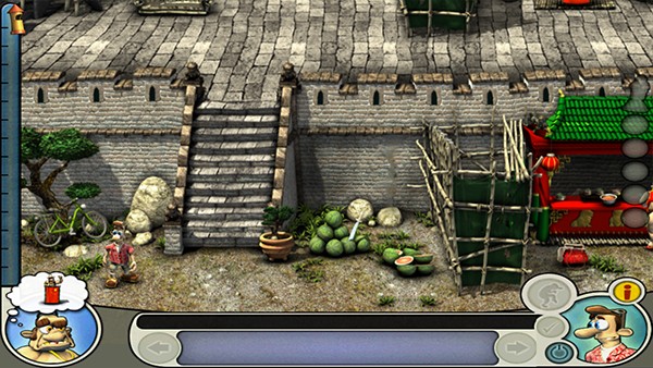 老头离开右下,到冰激淋机用BULLSHIT(巨佩服想出这个点子设计人员,恶搞无敌啊……);到左下,在牛身上用军刀,到左上,在地上使用汽油,等老头下去后到右中,在下水道盖上使用火柴;到右上,用鼓风机吹旺炭火,用石棉内裤包点炭火,把汽油倒到水盆里;回中上,躲到篓子里,等老头脱鞋进去参拜的时候把炭火放到拖鞋里,再躲到篓子里就OK了