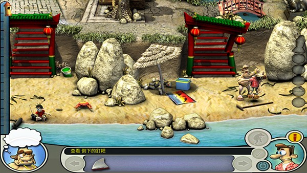 在物品都到手后,在老头跳水后,到跳板,使用弹簧,老头到右下后,到右上,在大象旁放下装满水的水桶,老头到左下,到右下,在海螺上使用螃蟹,然后再夹一只螃蟹,到左下,在小孩城堡放螃蟹,在毯子上放海胆,到左上,在遮阳篷的架子旁使用摩托脚踏,收起棚子,然后到跳板旁拿回弹簧再装上,到右上看好戏。