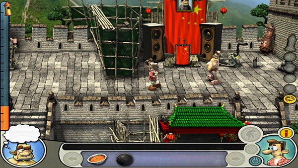 这关比较简单,先按提示拿热水袋,顺便拿右边箱子里的橡皮筋,然后上去按提示放热水袋,躲到烟囱里,等老头被他母亲打PP后,到左上,捡起玩具兔和有虱子的毛巾,然后在左上工具箱拿万能胶,等老头离开左下后,到左下,对楼梯旁的标枪使用橡皮筋,把玩具兔放到架子旁边的玩具箱上,然后到右下,使用有虱子的毛巾,然后老头离开右上后就马上上去,对放爆竹的箱子使用万能胶,然后马上下去或者躲到烟囱里,收工。