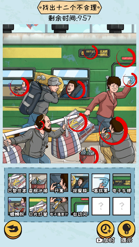 3、以“怀旧赶火车”为例,通过点击图片中奇怪的地方来完成找茬任务。