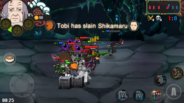 火影战记末日版全人物破解版是一款非常好玩的横批格斗类手游,以经典的火影忍者为创作题材,融合了动漫与刀塔元素,细腻的画面与场景模式让对战充满别样惊喜与乐趣。游戏中玩家有两名队友,三名对手,这些都是系统随机选定的,你需要打败对手并且破坏三座塔最终获取胜利,胜利可获得金币奖励。同时游戏内人物角色众多,鸣人、佐助、水门、凯、辉夜等火影人物你都可以选择,并且每位人物各有一个普通攻击、3个技能和2个奥义。此外,普通攻击是没有冷却时间的,3个小技能有加速、加血、攻击技能不等,技能冷却时间也不同,伤害不算很高,其中奥义是需要花费金币才能开启,而且花费数量巨大,当然威力也是巨大的,且部分人物奥义可变身。