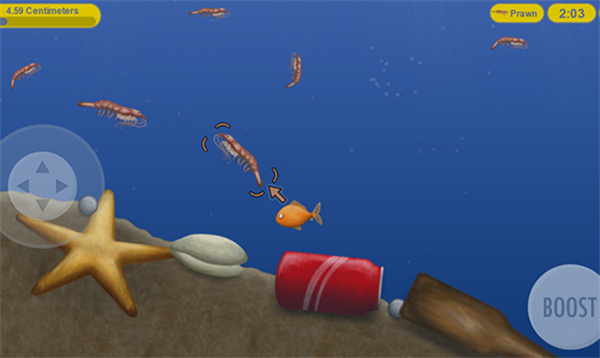 2、游戏中的控制采用虚拟摇杆操作方式,左边为控制小鱼的移动,游遍为耐力加速,点击即可获得加速效果。