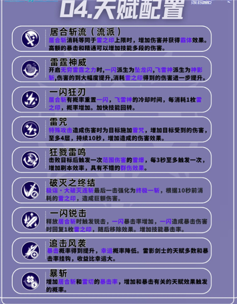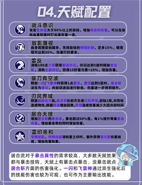居合流对于暴击属性的需求较高,大多数天赋效果都与暴击挂钩,天赋上有暴击点暴击,没暴击就点居合斩方面的伤害强化。