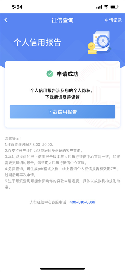 4、最后待申请成功,下载征信报告即可(注:一般两个小时以后就会出结果,七天有效,过期后可再次申请)
