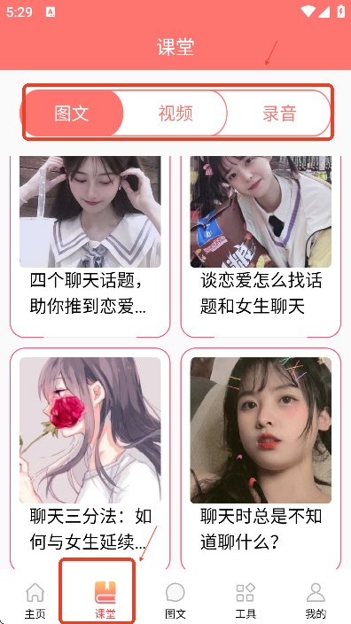 男生们也可以通过课堂板块的图文,视频,音频,对恋爱技巧进行更直观的学习