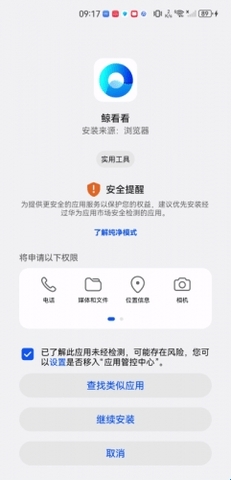 3、接下来点击勾选“已了解此应用未经检测……”,点击“继续安装”。(还可以点击了解纯净模式)