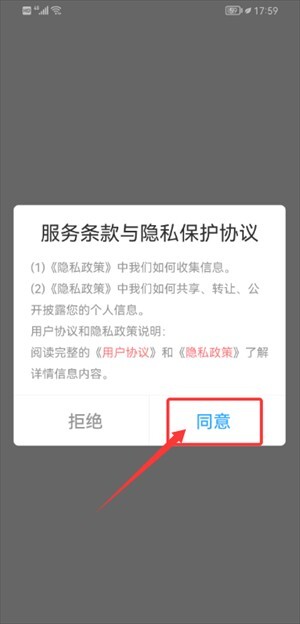 1. 启动应用,在服务条款与隐私协议页面点击“同意”按钮,即可进入。