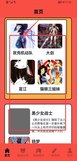 2. 首页呈现《攻壳机动队》《大剑》等多部漫画作品,能够直接阅读。