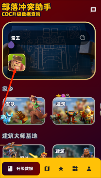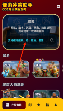 1、打开部落冲突助手app,进入升级数据页面,点击最上方搜索框