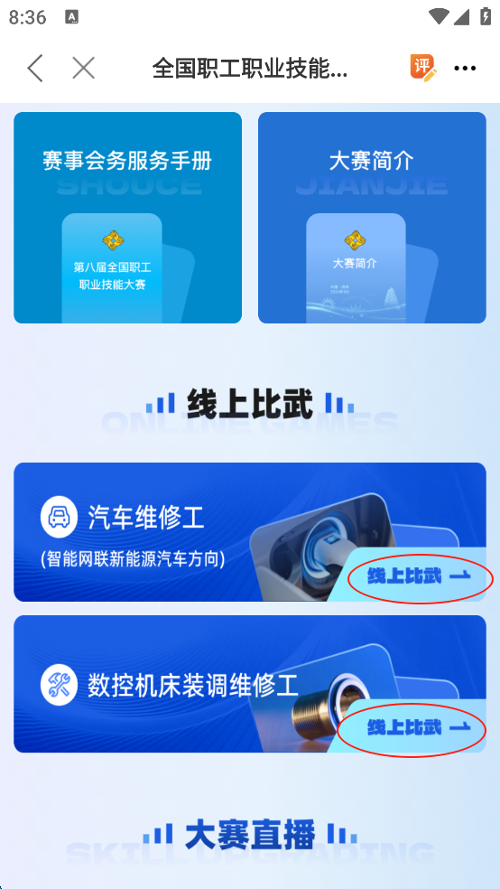 5、在下方可以选择自己比赛的方向,比如参加“汽车维修工”,点击该模块的“线上比武”。