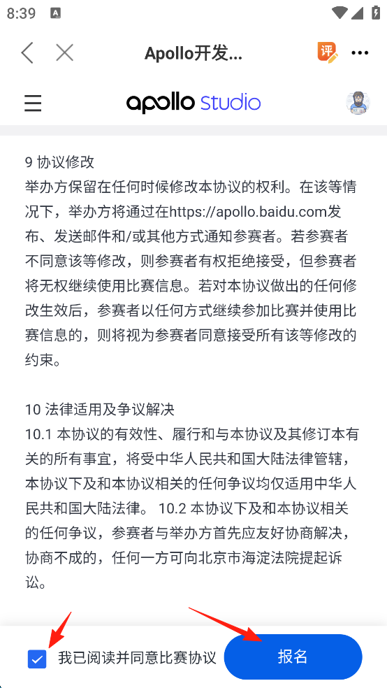 8、随后看完比赛协议,勾选左下角的“同意协议”,最后点击右下角的“报名”,这样就完成了比赛的报名。